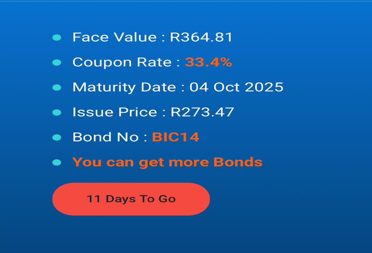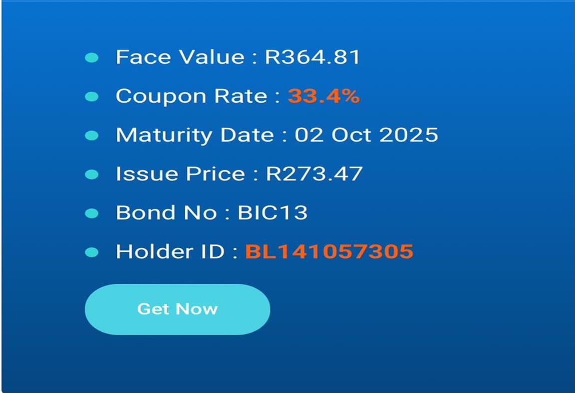 Let’s say you want to get this Bond, you will pay the Issue Price of R273.47 and the Maturity date will be 02 Oct 2025 at a Coupon Rate of 26.8% and the Face Value is R364.81 and the Bond Identification number is BIC13, to get this Bond you pay the issue price of R273.47 to the Bond Holder (BL141057305) on 02 Oct 2025 you will be getting the Face value as the issue price and the new Face value is determined by your Coupon Rate You can increase your Coupon Rate by inviting more Affiliates