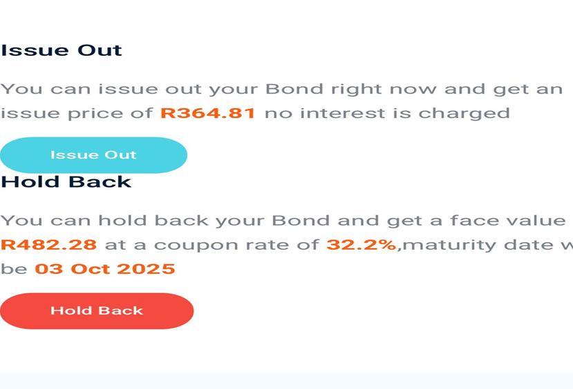 Now you can bargain with your Bond either to collect the Issue Price which is R364.81, take note when you acquired the Bond the Face value was at R364.81 but because of your Coupon Rate you now getting R482.28 So now you can Issue out or Hold Back your Bond and you will be getting R482.28 on 03 Oct at a Coupon Rate of 32.2%